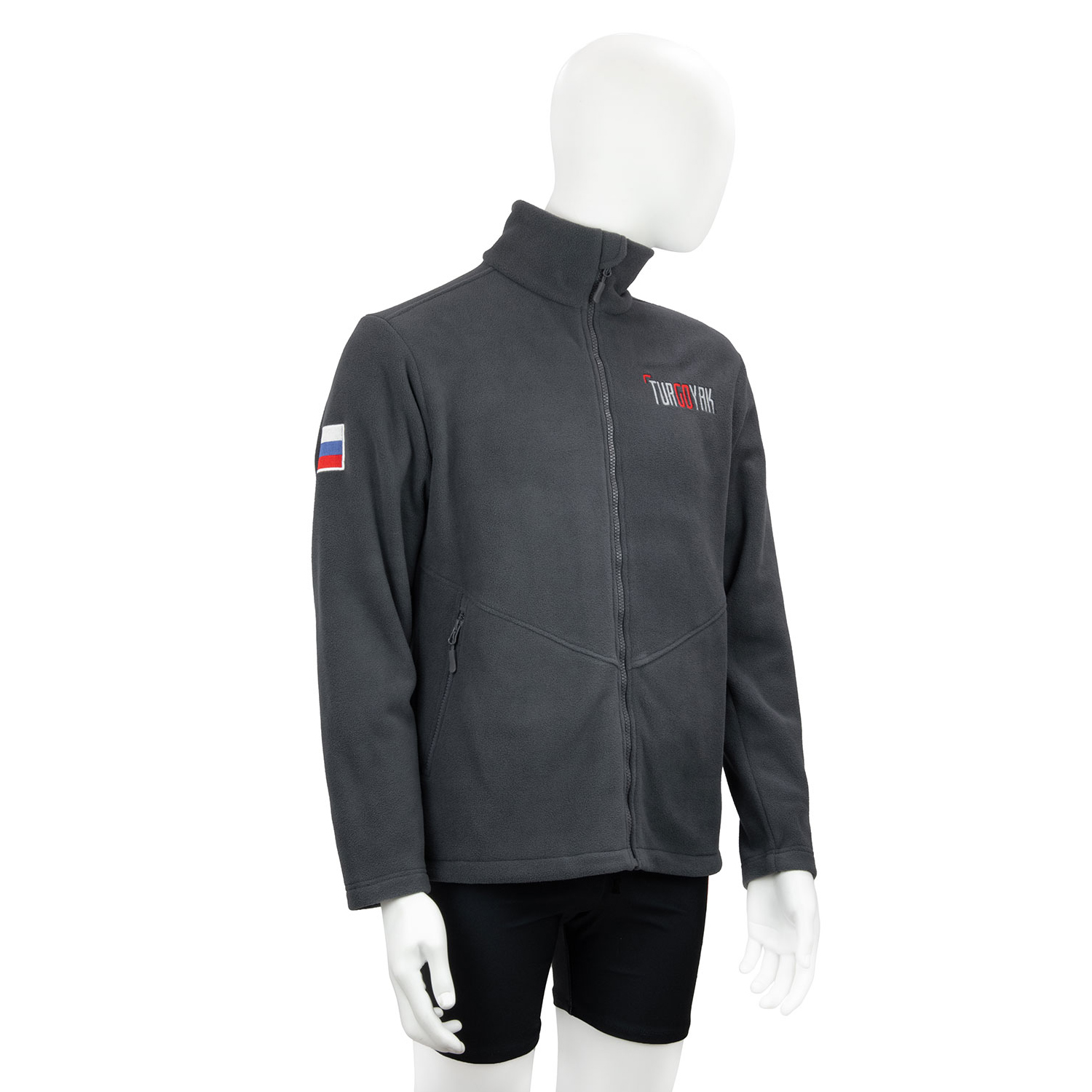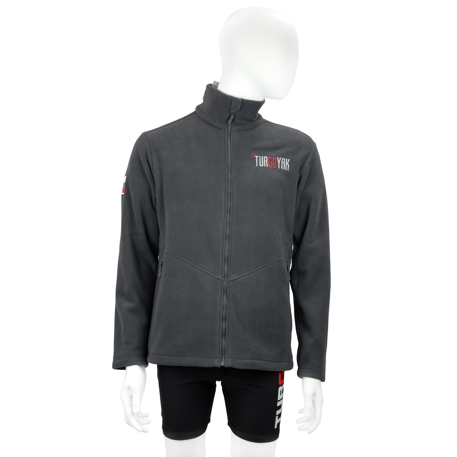 Толстовка флисовая TURGOYAK без капюшона — это стильная кофта длиной до бедра, выполненная в прямом крое без резинки по низу, застегивается на молнию. По бокам расположены карманы на молниях. Состав ткани — 100% полиэстер, гипоаллергенный, воздухопроницаемый и устойчивый к деформации материал. Лицевая сторона ткани имеет приятный на ощупь ворс, а изнанка — гладкую поверхность. Декор изделия включает вышивку слова TURGOYAK на груди, флаг РФ на правом плече и логотип Turgoyak Sports Territory на спине.