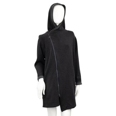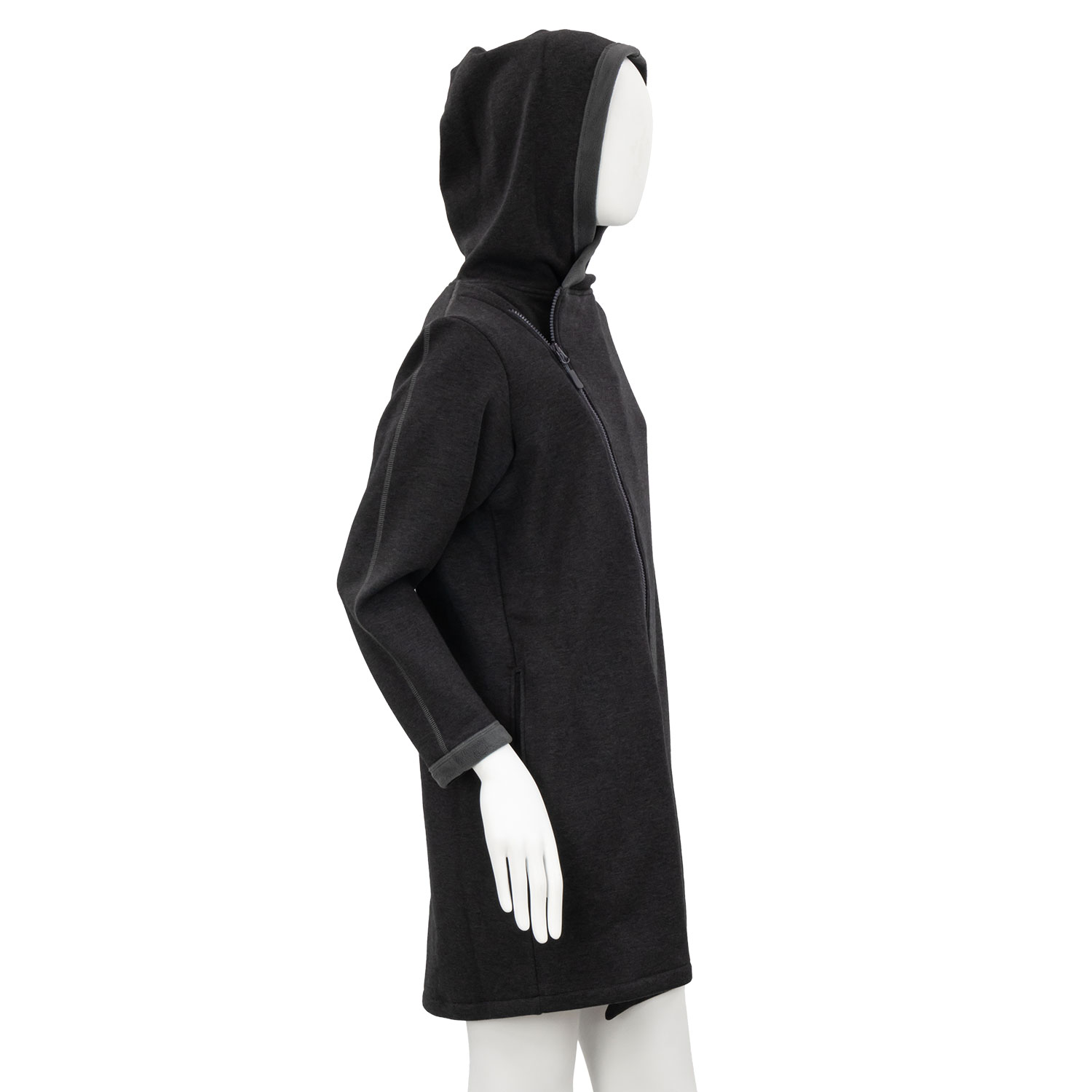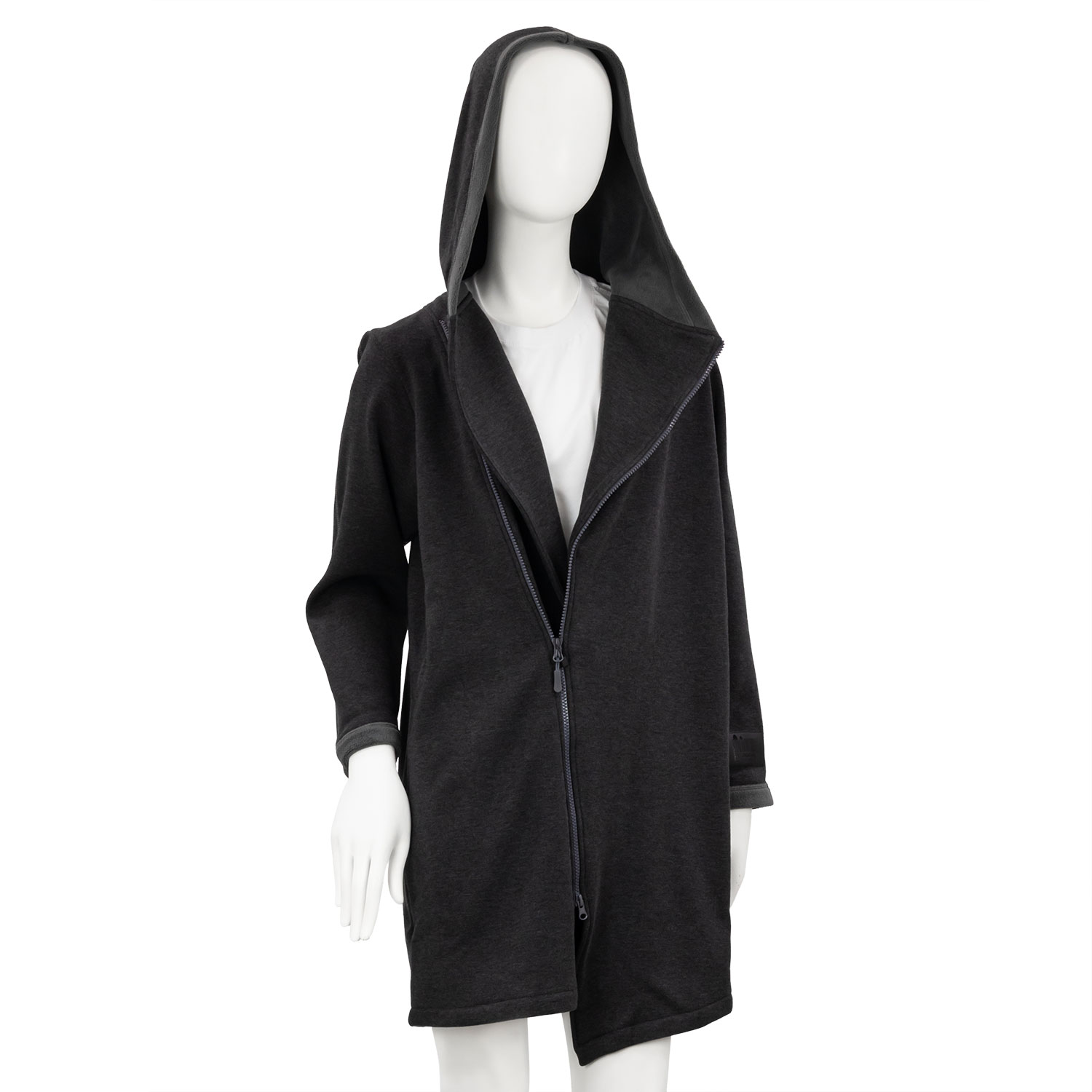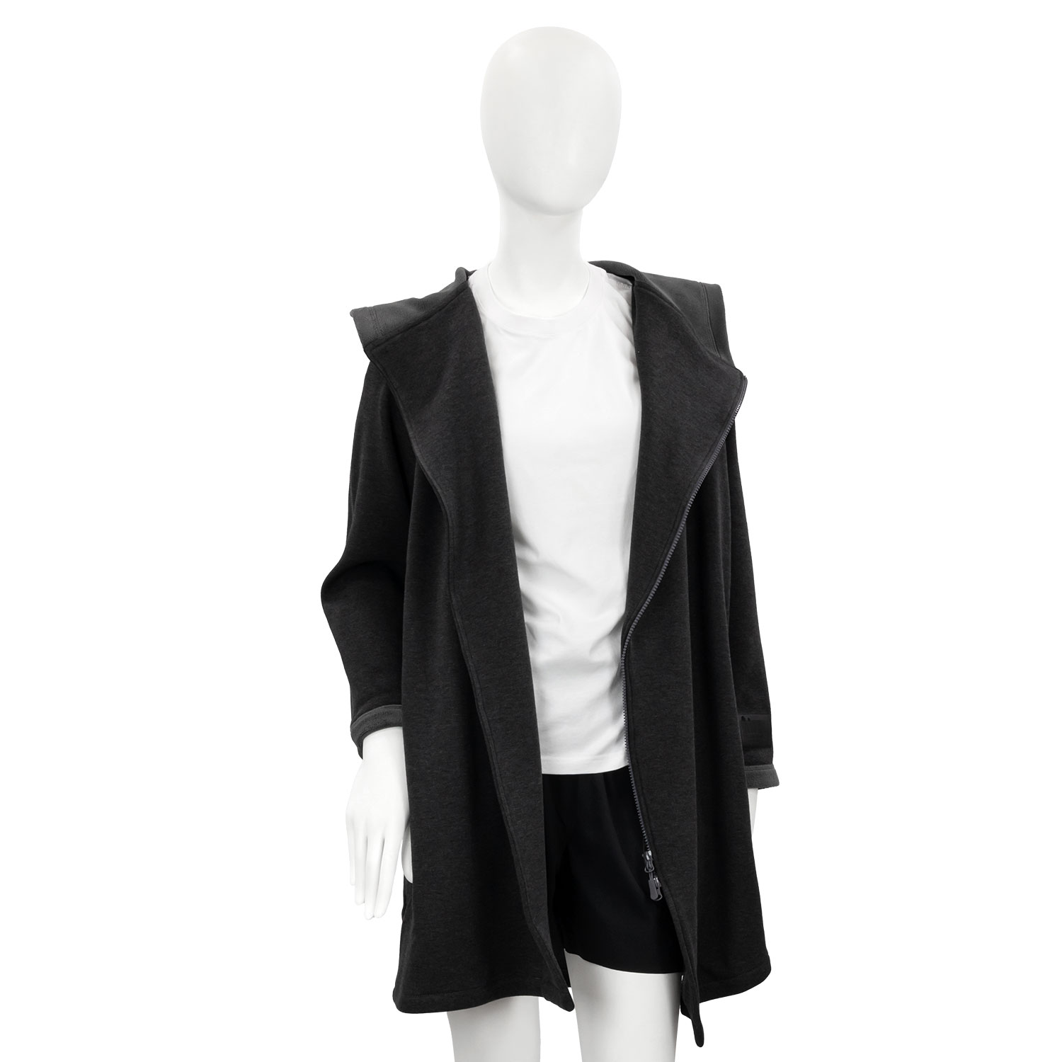 Пальто (мантия) с капюшоном — идеальный вариант для весны и осени. Длина изделия доходит до колена, что обеспечивает комфорт в прохладную погоду. Модель имеет расклёшенный асимметричный крой и косую молнию. По бокам расположены карманы без застёжек.