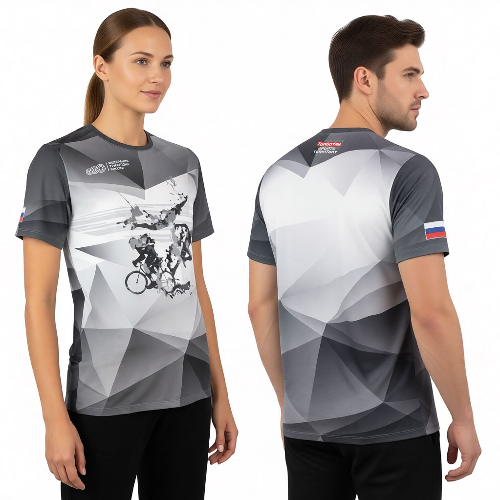 Дизайн футболки выполнен с символикой "Turgoyak sports territory" и Федерации триатлона России в серых тонах с изображением велосипедиста, бегуна и пловца.