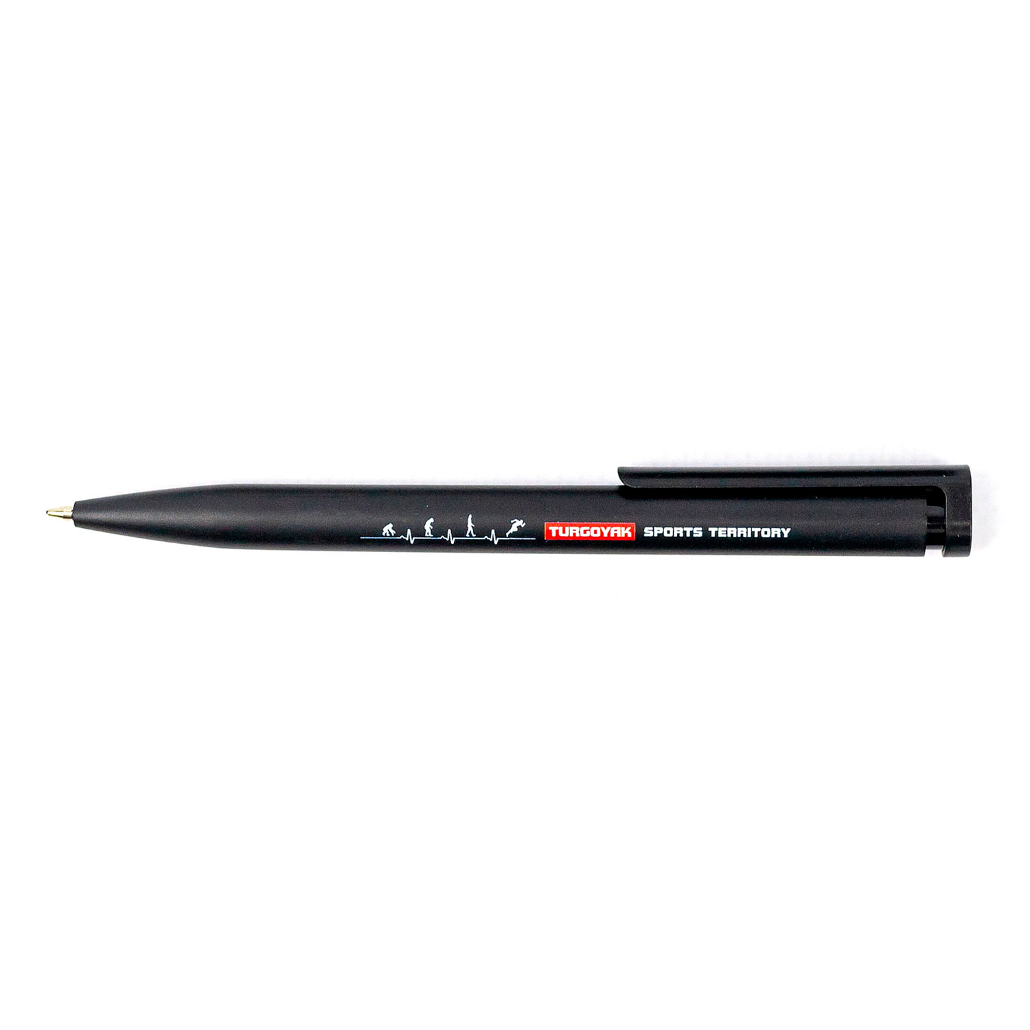Зона грипа не прорезинена, имеет гладкую поверхность. Заправлена ручка чернилами синего цвета. Пишущий наконечник пулевидного типа оснащен шариком диаметром 0,7 мм. На ручке изображен логотип Turgoyak sports territory.