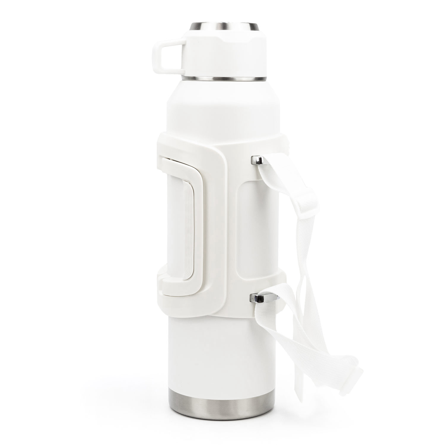 На корпусе термоса за две металлические петли закрепляется текстильный ремешок для переноски. Кроме этого термос имеет две несъемные ручки и две прорезиненные ножки для горизонтального размещения на плоской поверхности.
