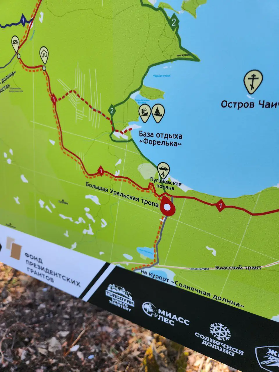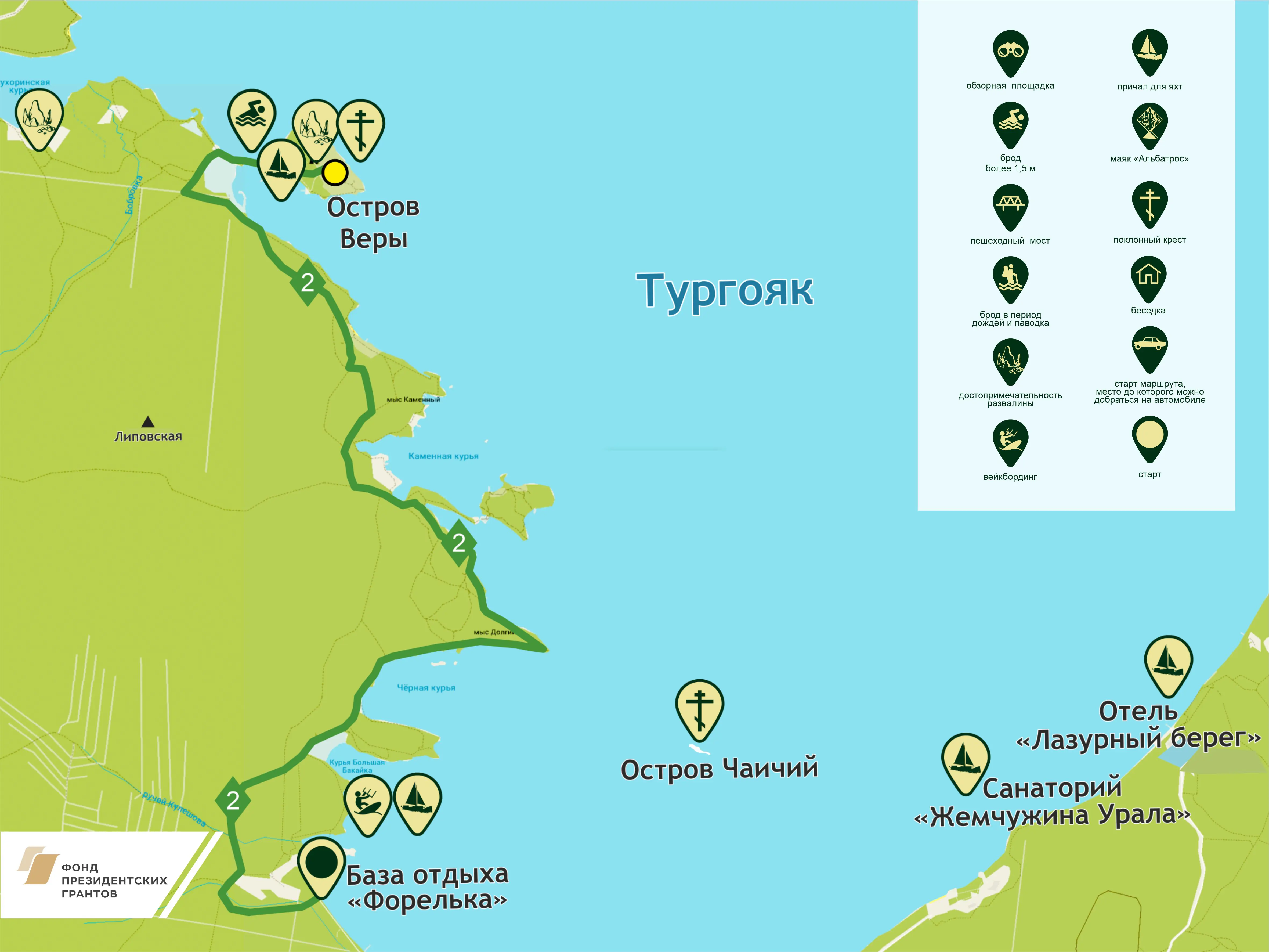 Однодневный радиальный круглогодичный пеший маршрут. Старт проходит от базы отдыха «Форелька», по берегу озера Тургояк до острова Веры через мыс Долгий и Каменный, что позволяет любоваться прекрасным видом на протяжении всего маршрута.