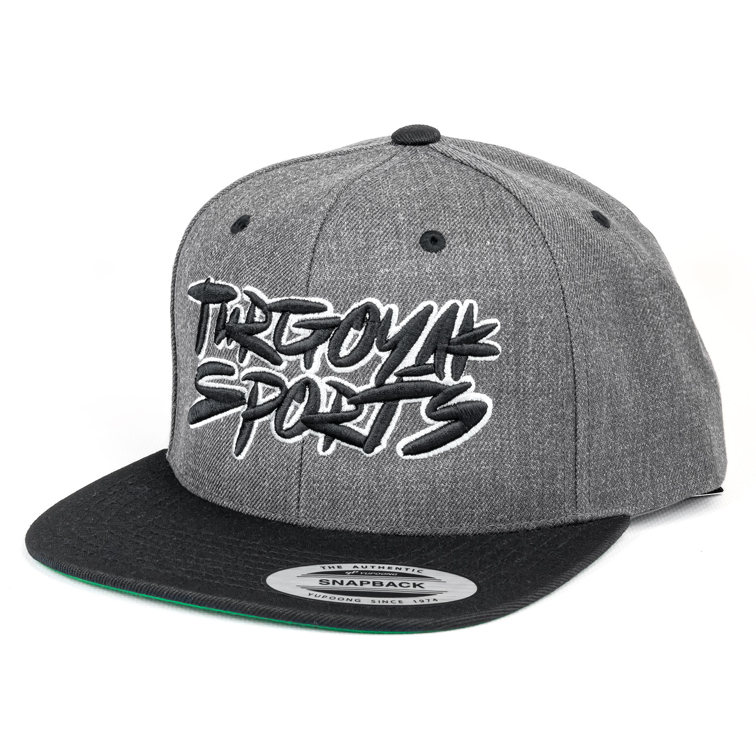 Темно-серая бейсболка с твердой передней панелью и прямым козырьком от корейского бренда FLEXFIT (ФЛЕКСФИТ), фасон Snapback (снепбек). Модель выполнена из плотного смесового материала, состоящего из акрила и шерсти (80%/20%). На передней панели объемная вышивка в стиле граффити Turgoyak Sports (Тургояк спорт). Сверху козырек черный, внутри козырек отделан контрастным ярко-зеленым материалом, сзади пластиковая застежка для регулировки размера.