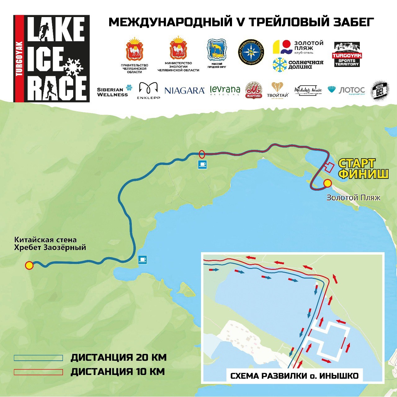 Дистанция 20 км - старт с территории Золотого пляжа, обегаем мыс по льду Тургояка и уходим на озеро Инышко, дальше двигаемся по дороге до отметки 8 км на котором будет размещён пункт питания. После него начинается подъём на Заозерный хребет. Набор высоты составит около 400 метров, протяжённость подъёма 1,5 км. С вершины хребта открывается невероятный вид на озеро Тургояк и Таганай. И дальше возвращаемся назад по тому же маршруту.